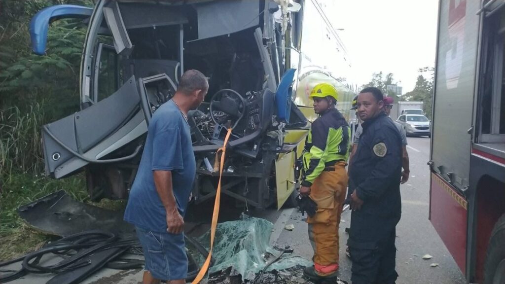 La Vega, República Dominicana — Un fuerte accidente de tránsito ocurrido en la Autopista Duarte, en el tramo comprendido entre La Vega y Bonao, provocó momentos de tensión luego de que un autobús de la empresa Caribe Tours colisionara con un vehículo de carga pesada, dejando al conductor de la unidad atrapado dentro de la cabina.